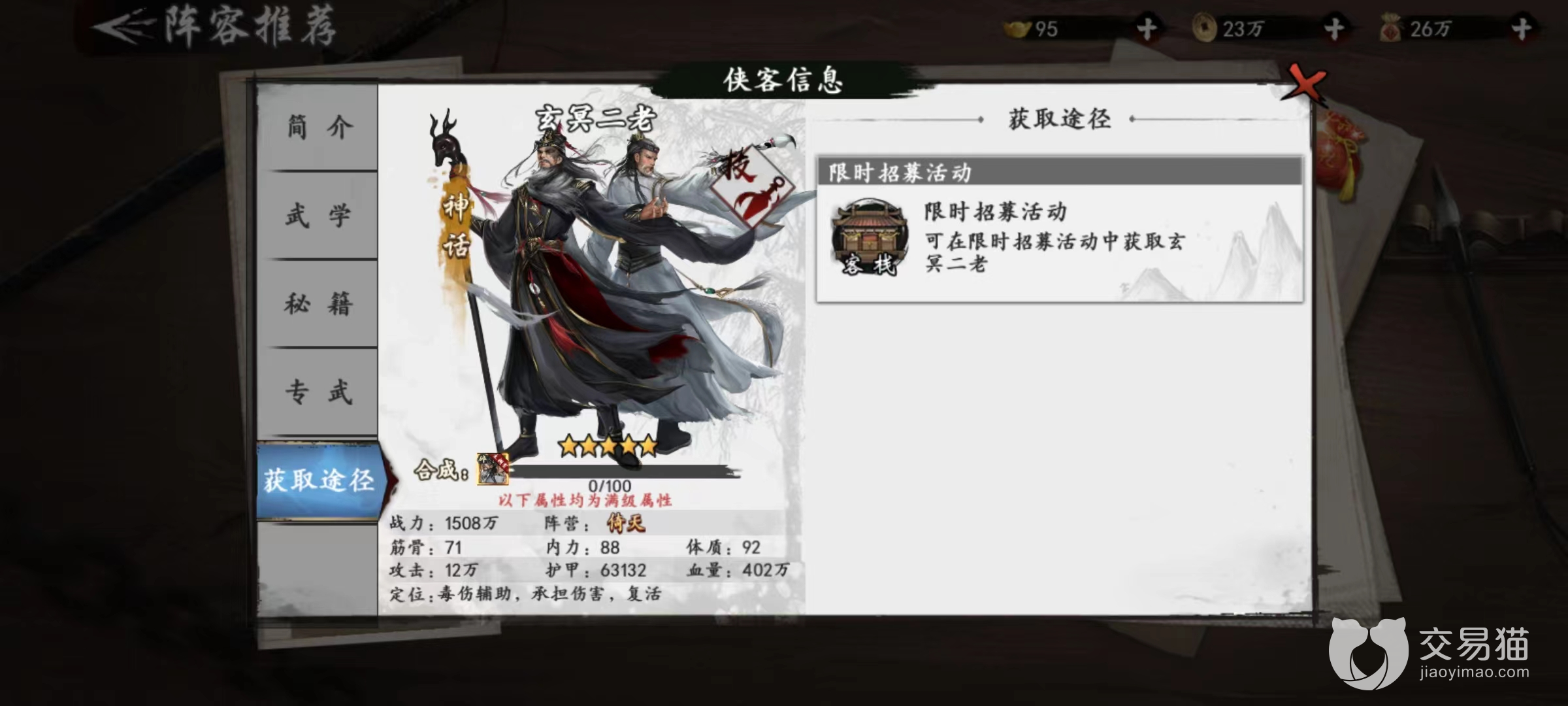 那这么强大的侠客,我们该怎么在游戏中去获取,目前游戏中给出的方法只有限时招募活动才能得到,所以这里大家一定好好的去攒一下票,等到玄冥二老的限时招募开启了,就有大把的机会招募到玄冥二老了。