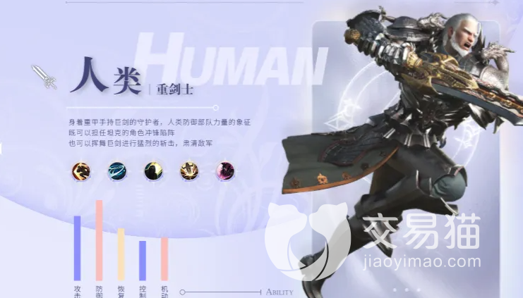第二位人类重剑士属于近战肉盾,角色的标志性服装就是厚重的盔甲,以及手持的锋利长剑。在让对手毫无还手之力,还能施展各种技能,一边承受攻击,一边保护同伴。大招则是在身体四周形成三面盾牌,增加防御,第五个技能,强行恐吓在场所有的目标,你的防御和攻击都会得到极大的提升。