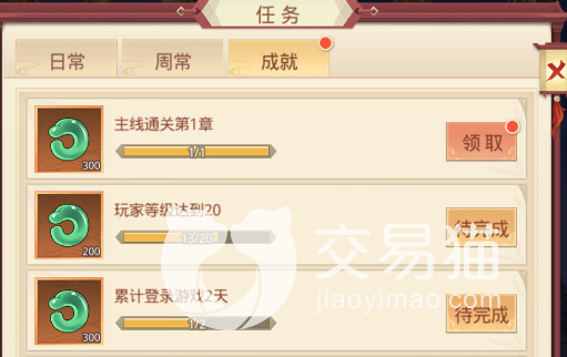 然后在进入游戏以后,玩家可通过通关各种主线任务来完成成就,每一章都会有一个相对应的成就,除此之外,还有各种等级成就、登录成就等,完成了这些就会获得一定数量的仙玉。
