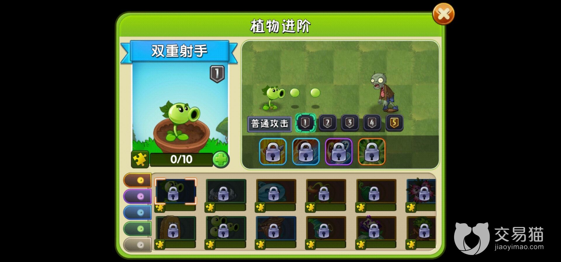 10、双重射手,每次可以向前发射两颗豌豆对僵尸造成伤害,种植需要花费200阳光,技能效果为向前方发射大量豌豆后会发射一颗巨型豌豆造成伤害。
