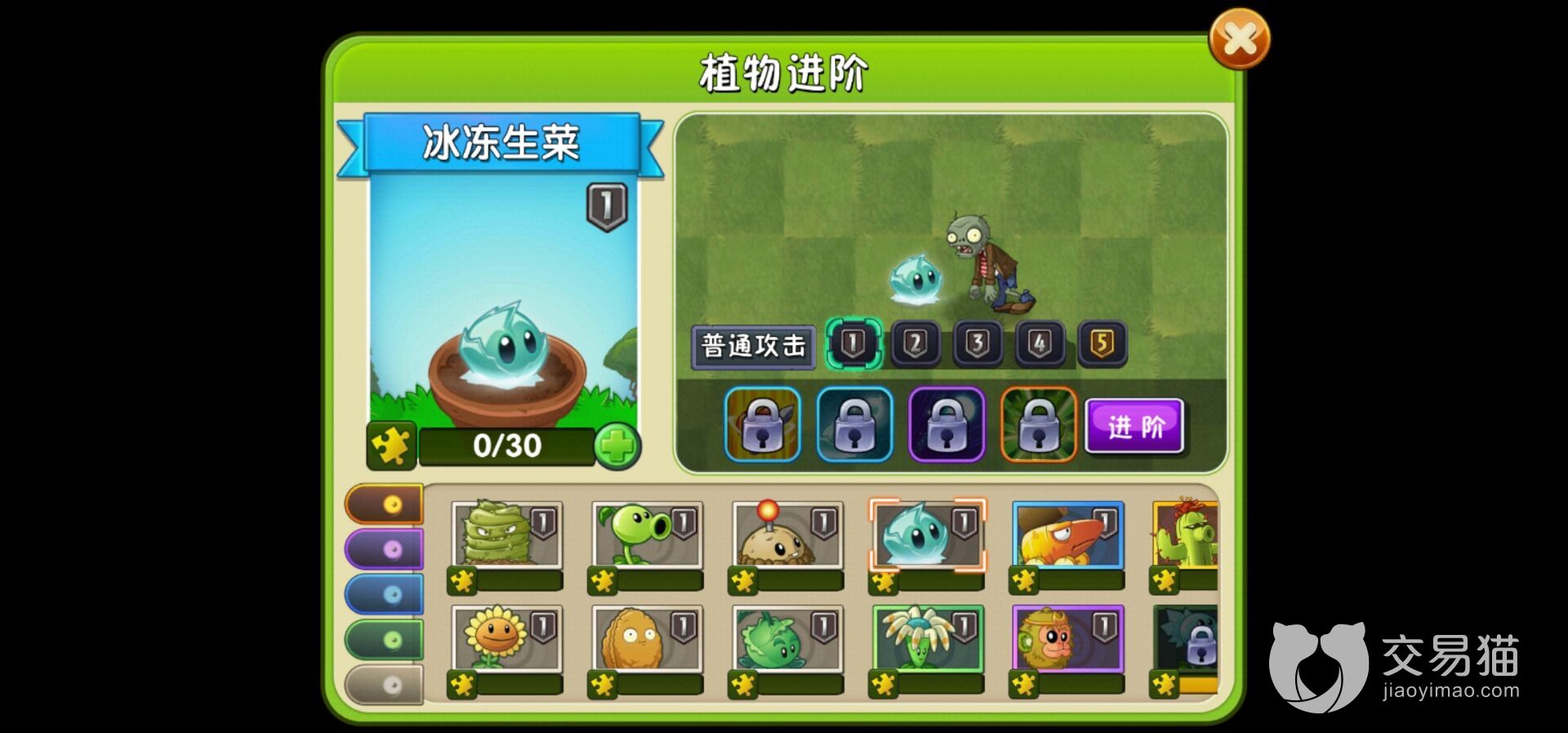 6、冰冻生菜,冻住踩到的僵尸,也可以熄灭火炬僵尸的火把,种植不用阳光,技能效果为冻住全屏僵尸。