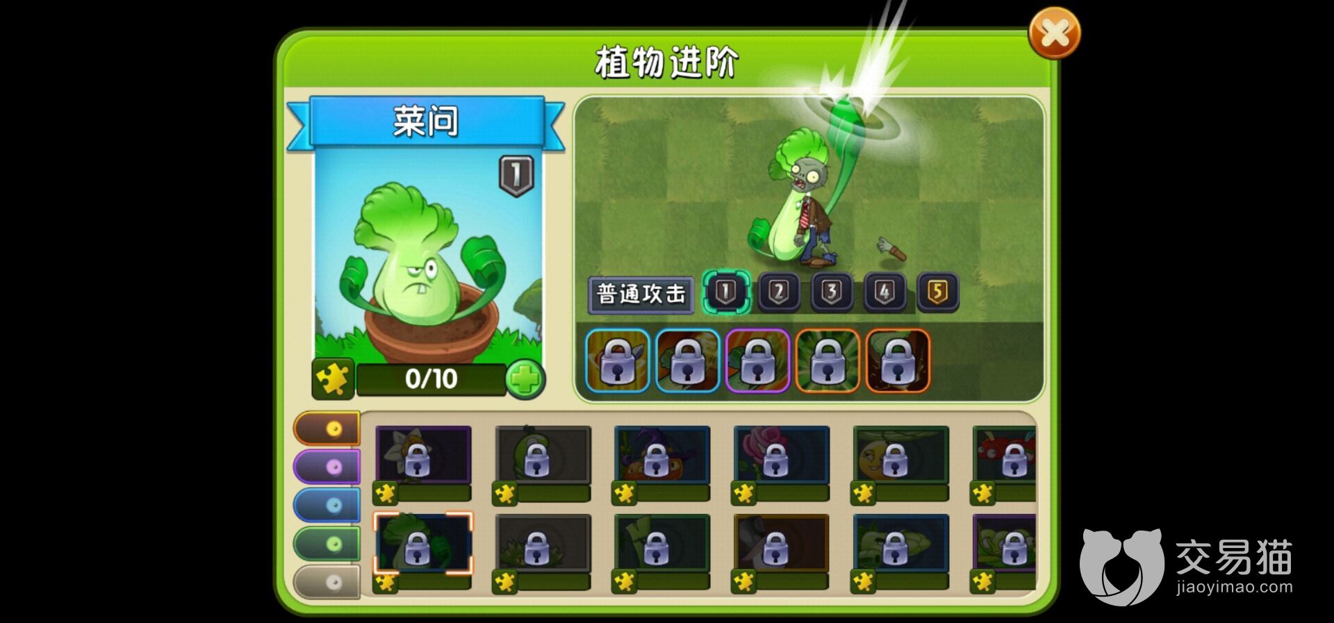 9、菜问,能够快速的击打前后的僵尸,种植需要150阳光,技能效果为对自身周围僵尸造成大量伤害。