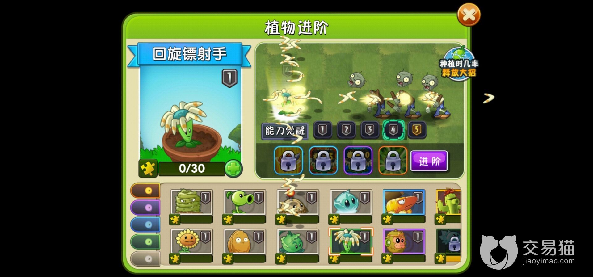 7、回旋镖射手,向前发射回旋镖对僵尸造成伤害,种植需要175阳光,技能效果为向前方和左右发射大量回旋镖造成伤害。