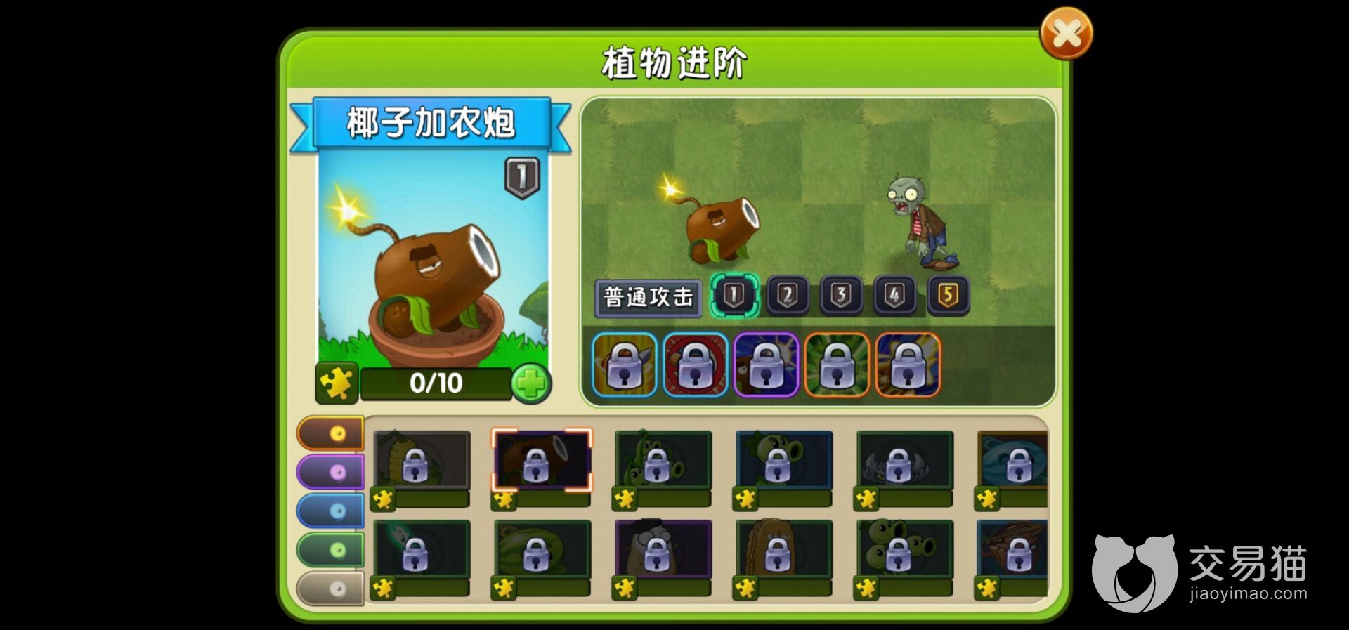 14、椰子加农炮,需要点击向前方开炮对僵尸造成范围伤害,种植需要400阳光,技能效果为发射一颗延迟爆炸的炮弹并击退僵尸。