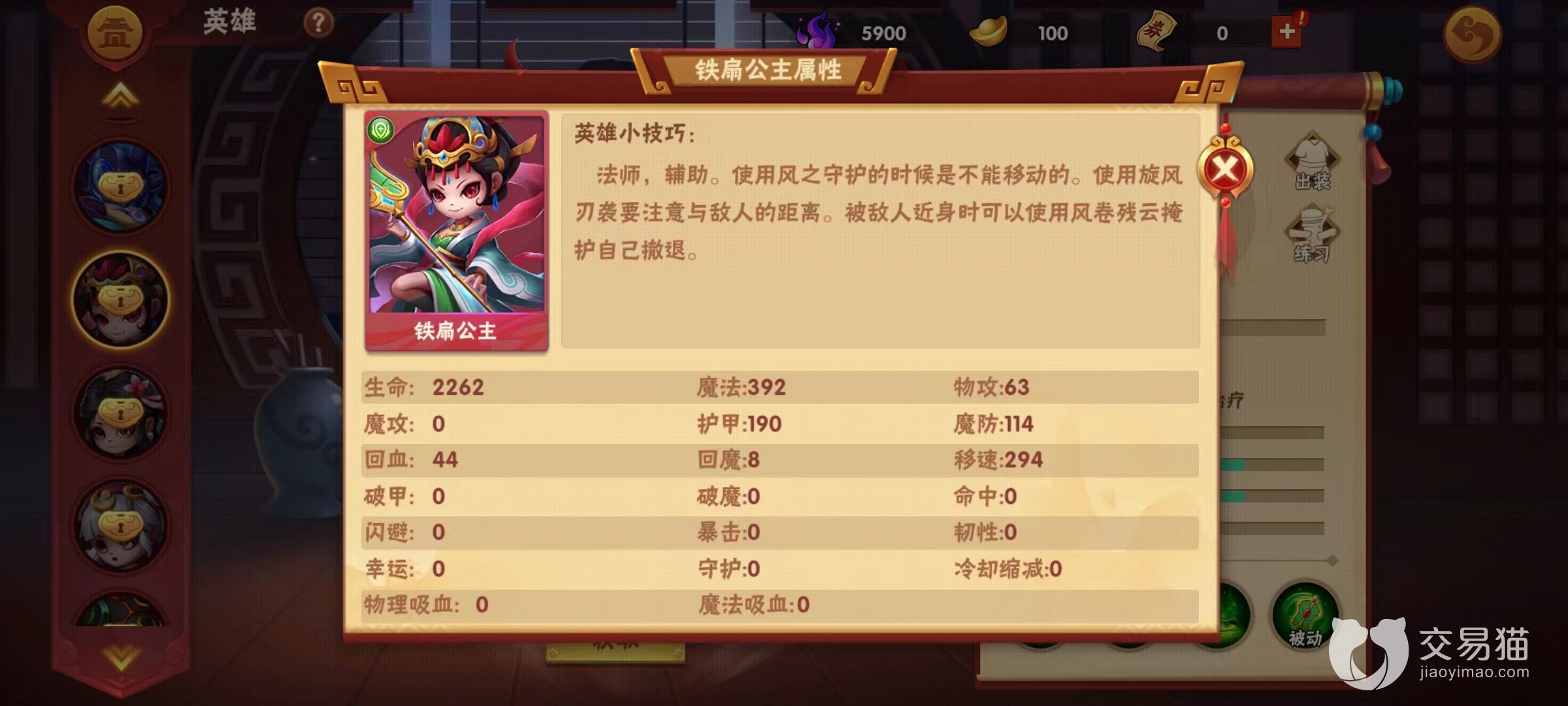 综上所述铁扇公主的定位是辅助,对线能力比较弱,一般主发育就行了。灵活且控制手段多,只要不动杀心敌人也很难击杀铁扇公主。