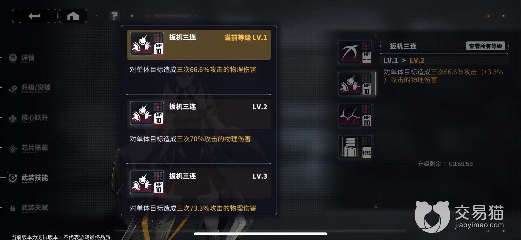 升级完之后之后我们就需要进行武装技能突破,一共会有四个不同的技能,我们要优先升级输出技能,输出技能升级完成之后再升级大招,大招基本上都是消耗型技能,可以帮助队伍快速的消耗对手血量。