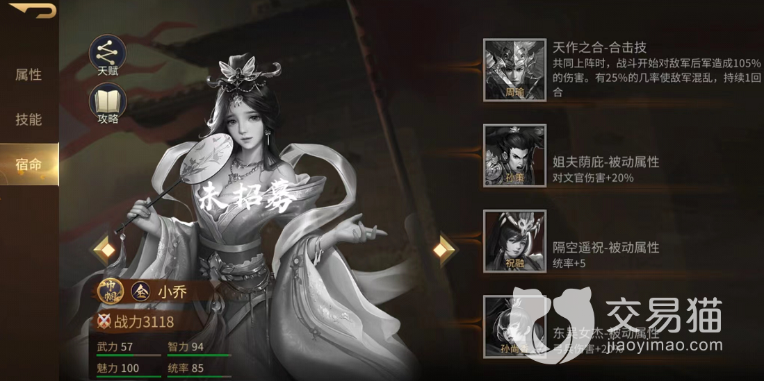 闪避也是很不错的,我们在战斗的时候可以增加19%的闪避伤害,这样的话在我们就能处于一个相对主动的位置,拥有四个宿命效果,可以搭配周瑜,孙策,祝融以及孙尚香进行使用,可以将伤害最高提升至25%左右,非常的强大。