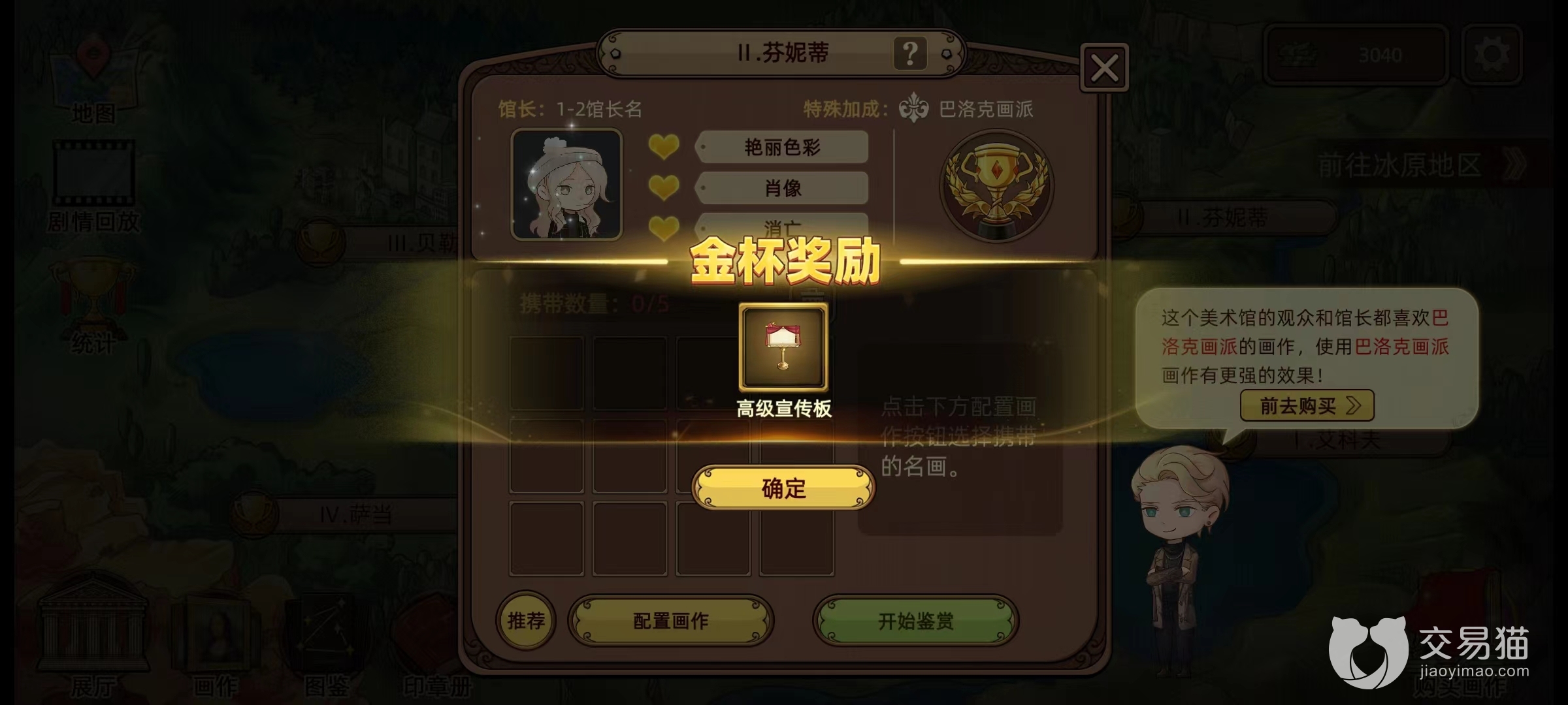 画作最多可以携带6个,我们尽量在自己的画作中选择标签不同的,同属于一个作者的。如果我们前期携带的画作馆长和观众都不喜欢,在挑战中也可以随时添加,但是每添加一幅需要50绿币。