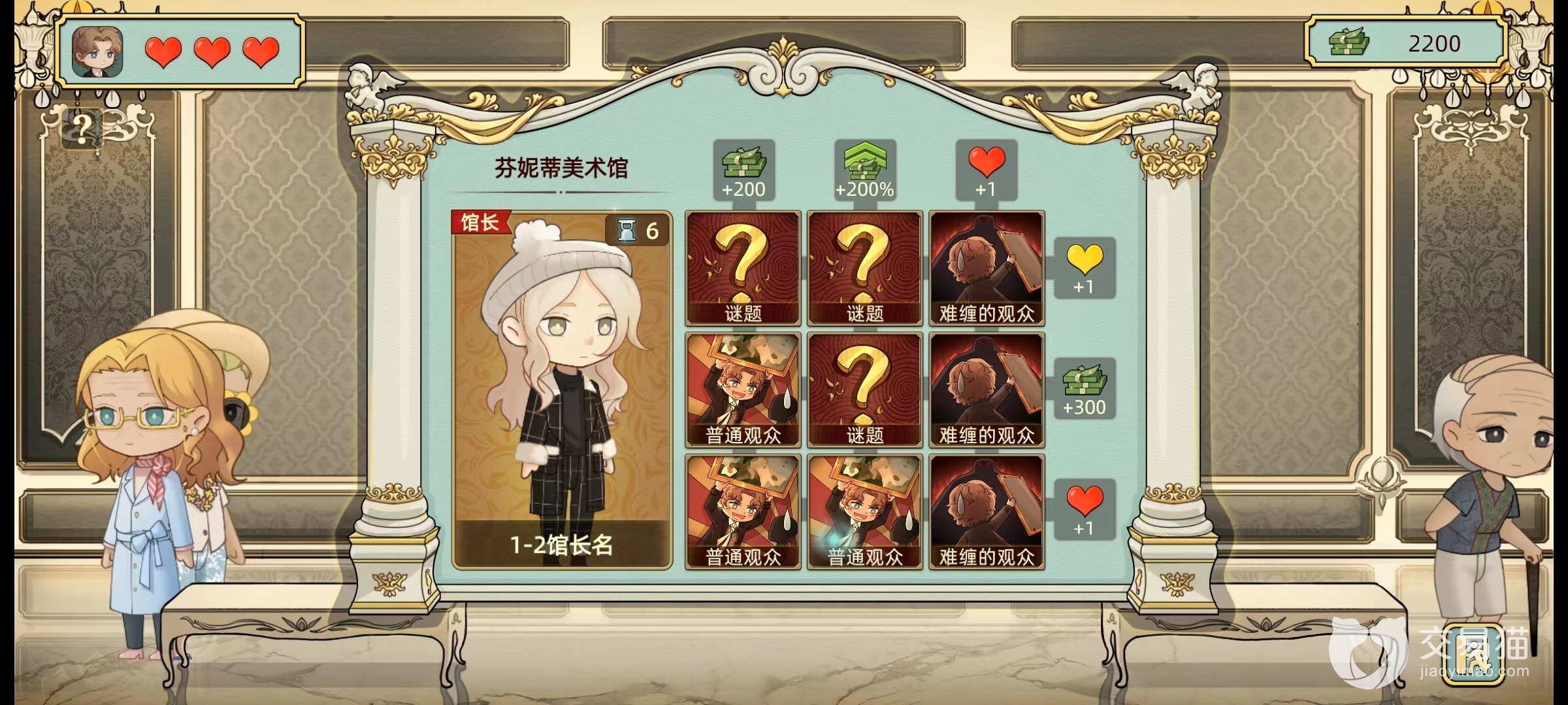 游戏中有9个格子,我们尽量选择加金币、体力或是普通观众的格子,这样挑战会比较简单。馆长试炼的话,我们要注意她提到的关键词,芬妮蒂馆长喜欢画家“描绘的真实,是不加修饰的自然消亡”,与之相关的作品就是“捧果篮的男孩”