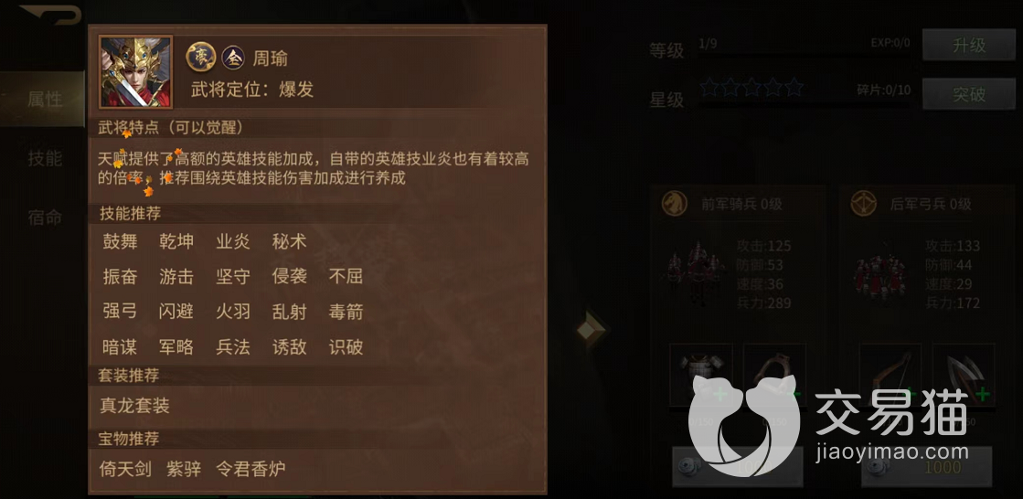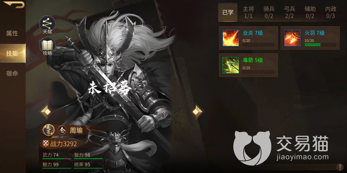 周瑜武将的定位为爆发,拥有超高的英雄技能加成,我们可以在战斗的时候为自身提升一定的倍率,培养这个角色主要就是围绕英雄的技能伤害来进行加成,养成一共会有不同的技能推荐,小编比较推荐大家使用鼓舞、乾坤、振奋,暗谋以及兵法。可以选择业炎与毒箭,这两个都是可以搭配输出进行使用的。
