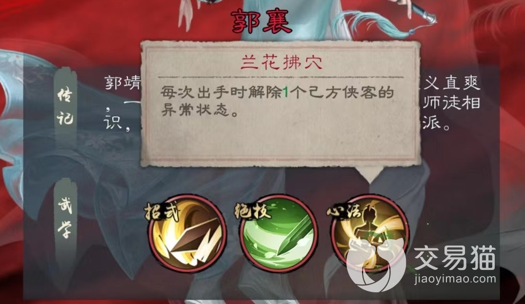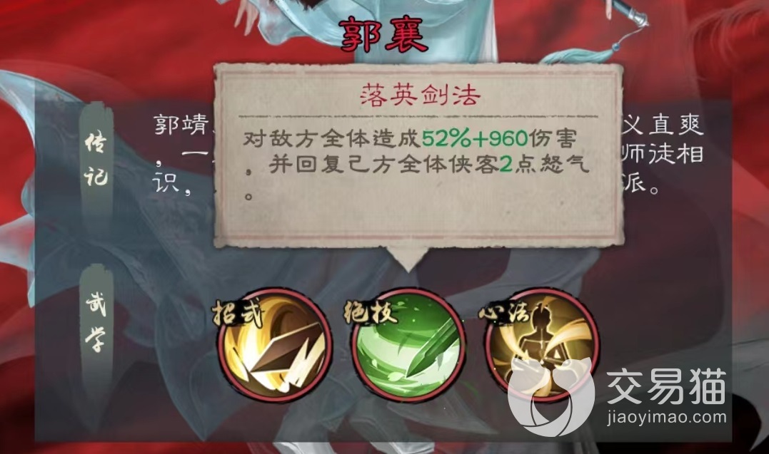 郭襄属于红色品质的辅助型侠客,大家千万不要小看辅助型,在这款游戏中很多场合都需要强势辅助才能发挥出阵容最大的特点。郭襄主要依靠绝技落英剑法伤害对方全体,并且为己方所有侠客恢复两点怒气。这一效果非常强大,尤其是怒气回复更是赢得了顶级发动机的称号。所有侠客在使用绝技时都需要怒气帮助,也就相当于只要队伍中有了郭襄,就能比对面释放出更多的技能,而现在所有输出中绝技占了绝大部分。