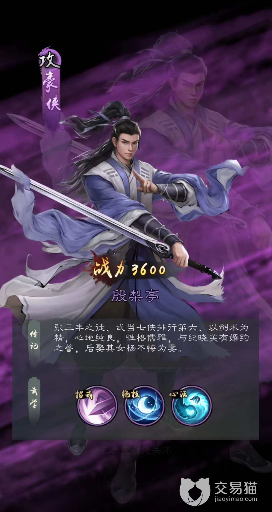 殷梨亭同为武当七侠之一,绝技三环套月伤害对方后排全体目标,如果对方血气高于半血则有额外伤害加成,在武当心法加持下,每提升一级攻击力增加30点。杨不悔绝技莲溪剑法,可以为己方血量比较低的两名目标恢复气血,心法弱水决可以提供血气上限加成,这两名角色虽然紫色品质,不过技能输出和辅助效果都很不错。这样整个阵容中群体伤害占了最大比重,也有不俗的单体输出和加血效果,后期再添加上张翠山、殷素素这样的宗师输出侠客就能往更高层次挑战。