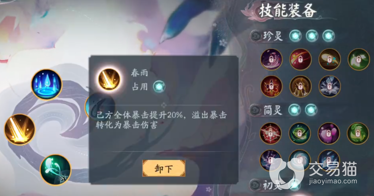 1、初灵选择:这个是最底下一行的BUFF,推荐的选择方案为春雨(已方全体暴击提升20%,溢出暴击转化为暴击伤害)、莹蔓(己方全体速度提升20点)、霜除(前3回合造成伤害提升20%)、时雨(回合内对敌方单位造成首次伤害提升20%)。