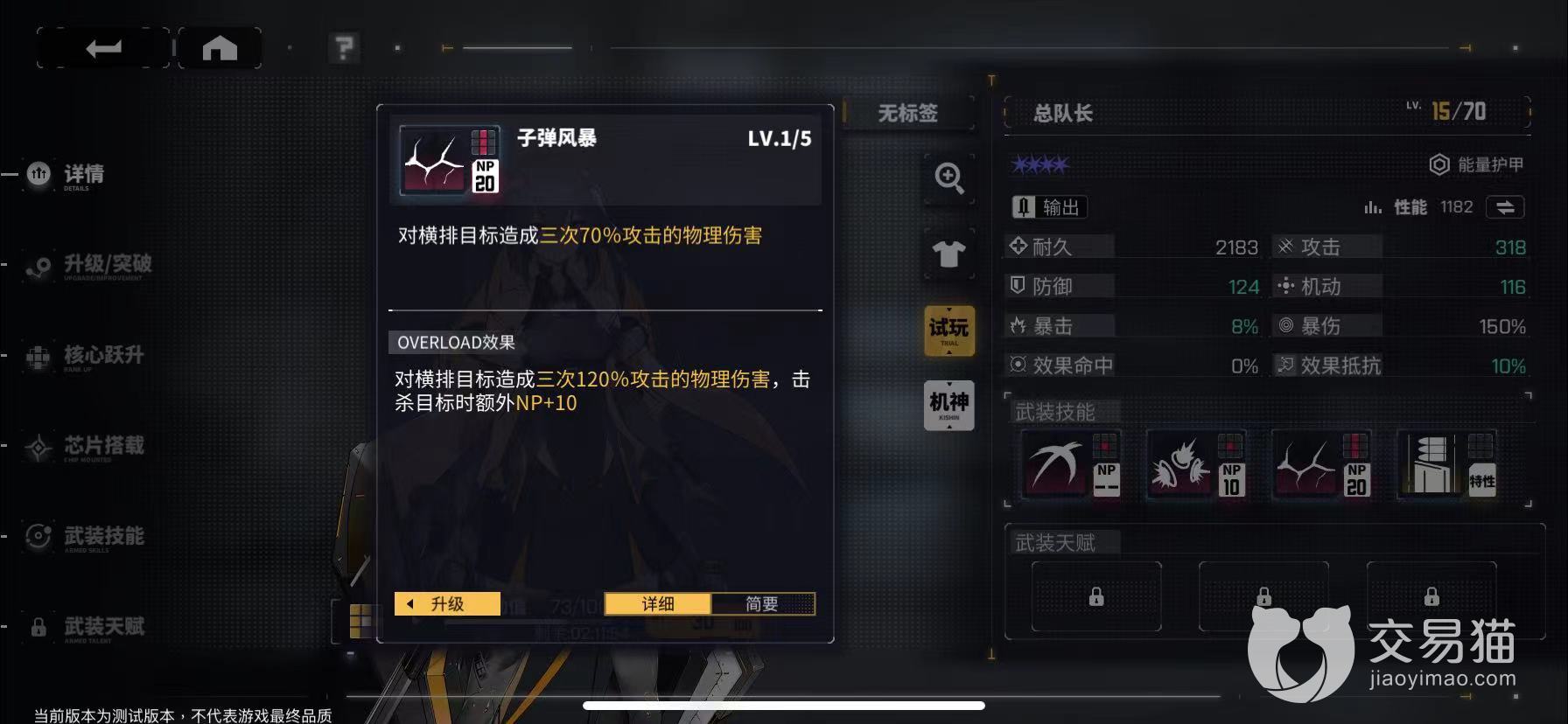 她一共有四个技能,一技能为枪刃斩击,可以对单体目标造成一次100%的物理攻击伤害,并获取一层的弹药装填。二技能为板机三联,可以对敌方单体目标造成三次70%攻击的物理伤害。最后一个大招为子弹风暴,可以对横排目标造成百3次70%的物理攻击伤害,需要消耗NP10点,总队长还有一个特性技能,为弹药装填,可以每层多造成5%的伤害,最高可以叠加三成,而且每回合自身额外可以恢复SP10点。