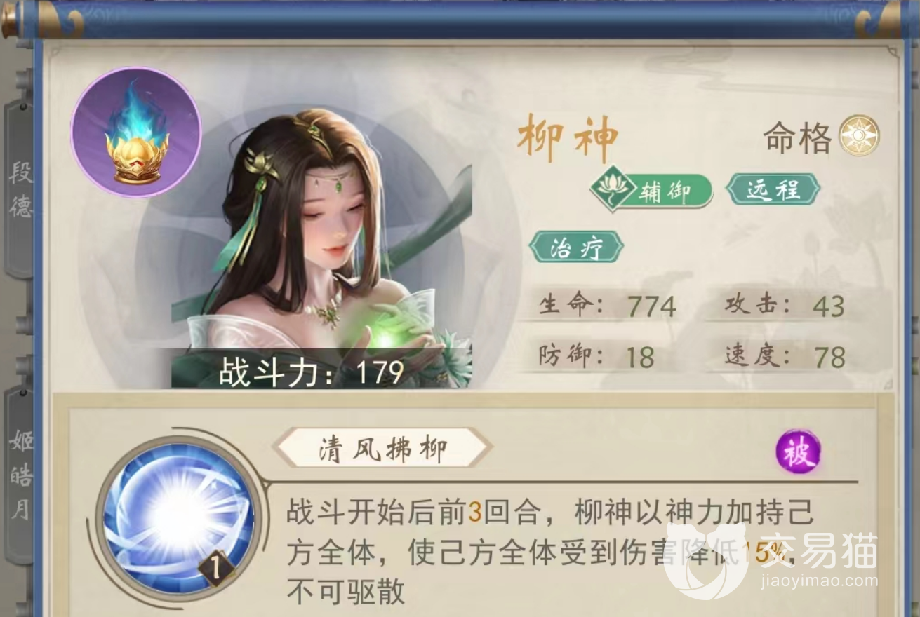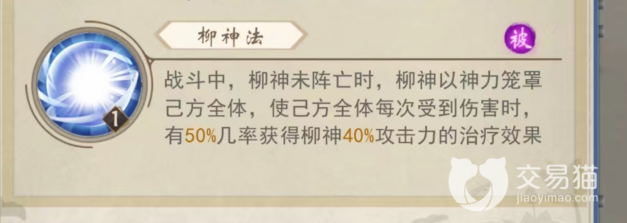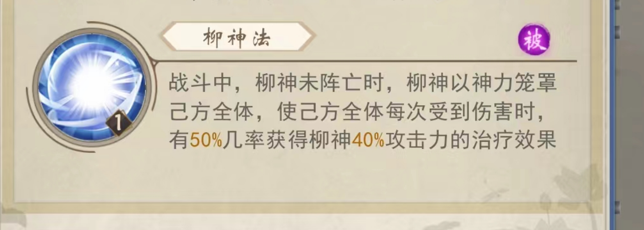 被动绝招柳神法,当柳神在场时,可以以神力笼罩整个全体,每次受到伤害时,有50%的几率获得其攻击力40%的治疗。注意是每一次受到伤害都可以触发这个技能,敌方是多段攻击或者是带毒的伤害的话,都可以额外触发治疗,使得我方获得更多的回复。这个技能是柳神整个辅助的最大作用即大量回血,可以说,作为治疗来说完全是顶尖级别。