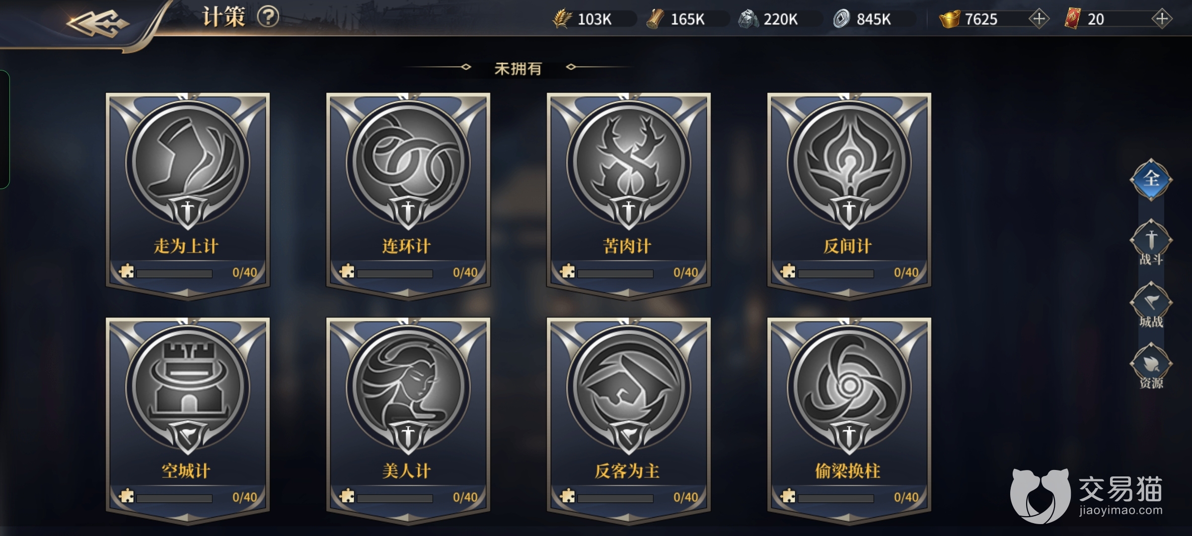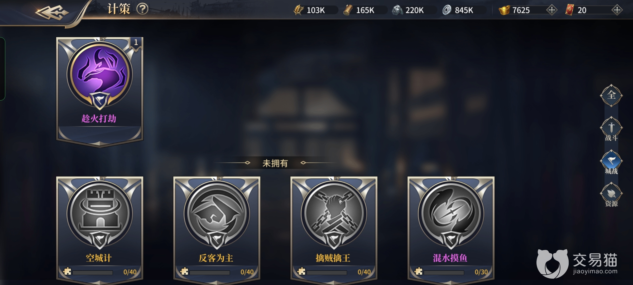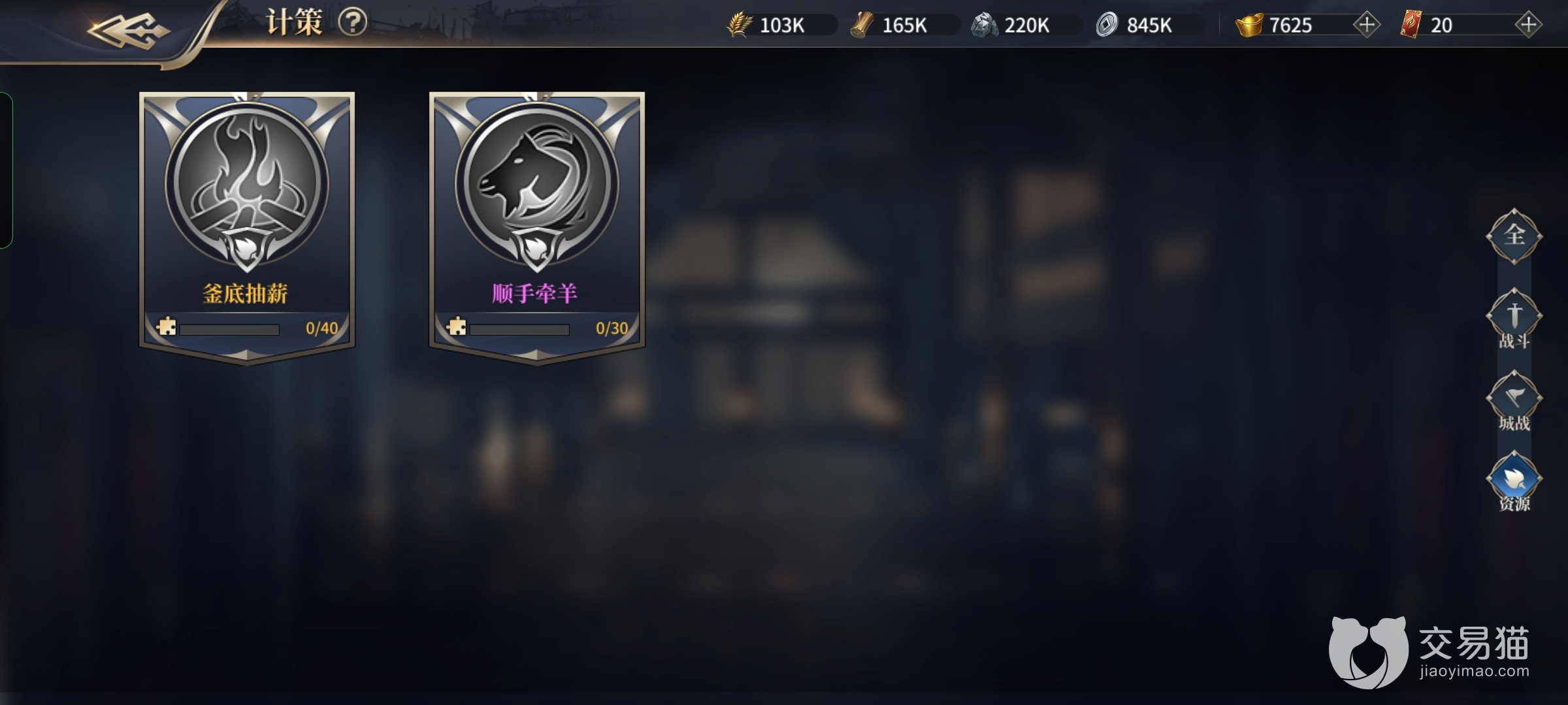 一开始玩家通过参加丝绸之路和其他人组队可以获取到碎片,然后后续的活动之中玩家可以找到金色的计策,只是难度肯定是更高的,计策分为战斗城战和资源三个分类。