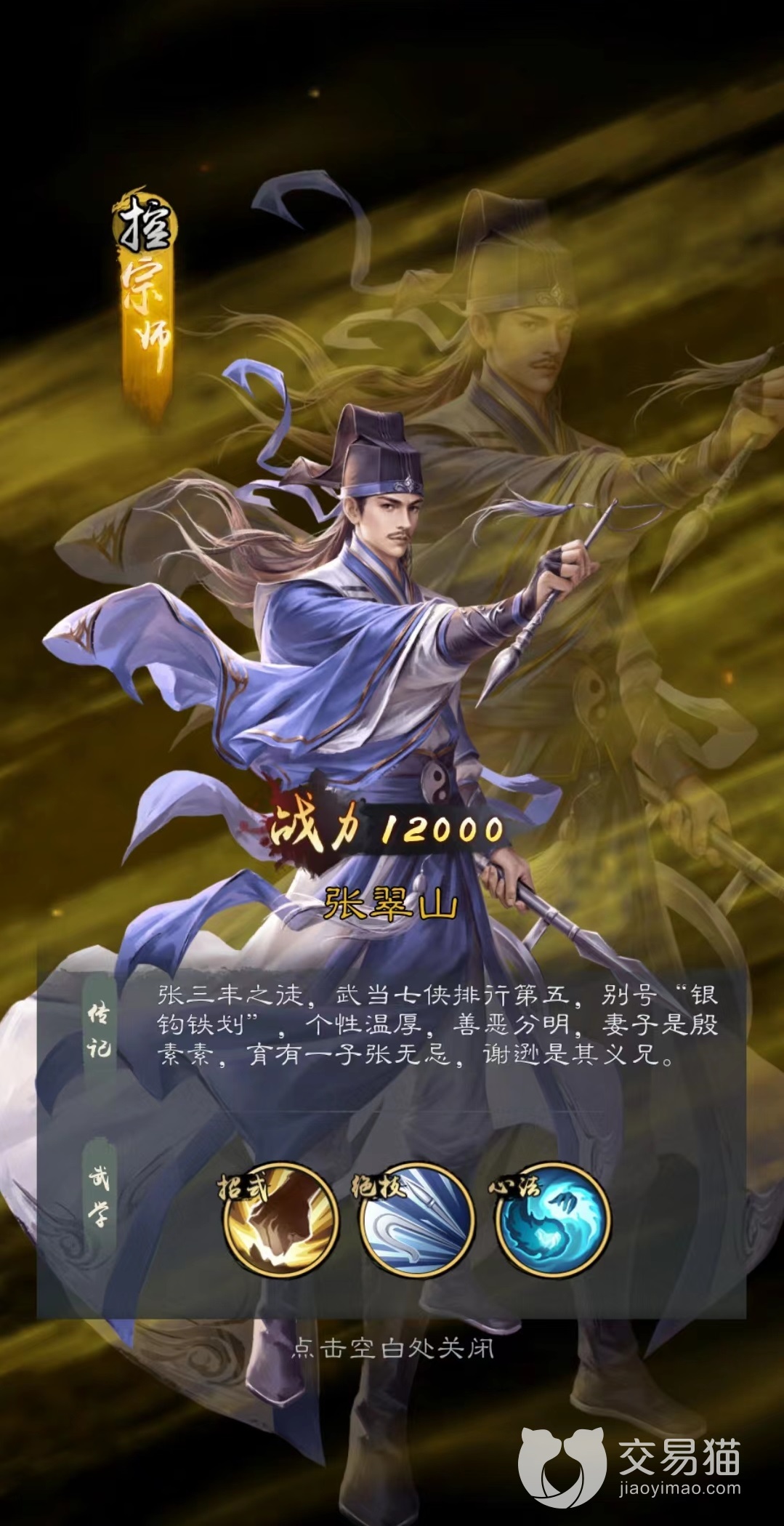 张翠山是很好用的控制角色,绝技银钩铁画,锁定对方后排造成伤害,同时有极高几率为其附加沉默效果。被沉默的敌人只能进行普通攻击而无法使用绝技,相当于封锁了绝大部分的伤害,在武当心法的加成下,每提升一级获得30点攻击力加成,这一心法效果虽然没有其他的功能,但仅仅是攻击提升就已经秒杀了绝大多数宗师级侠客,使得张翠山在后期能有极高的攻击力。