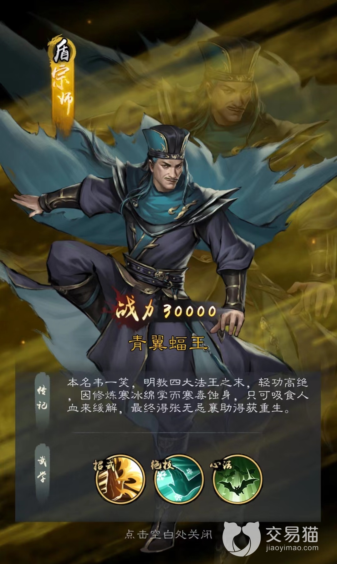 青翼蝠王在本作中被设定为了防御型的角色,那是因为自身技能寒冰绵掌在锁定敌方攻击力最高侠客进行输出之后,还可以恢复等量气血值。在所有吸血技能青翼蝠王的这一个是吸血量最多的,所以他的防御能力主要就来自于吸血,缺点是比较怕控制,如果无法释放大招吸血那自身就会很脆弱。好在有心法绝顶轻功的帮助,每受到三次伤害下次伤害必定会闪避,也起到了一定的效果。