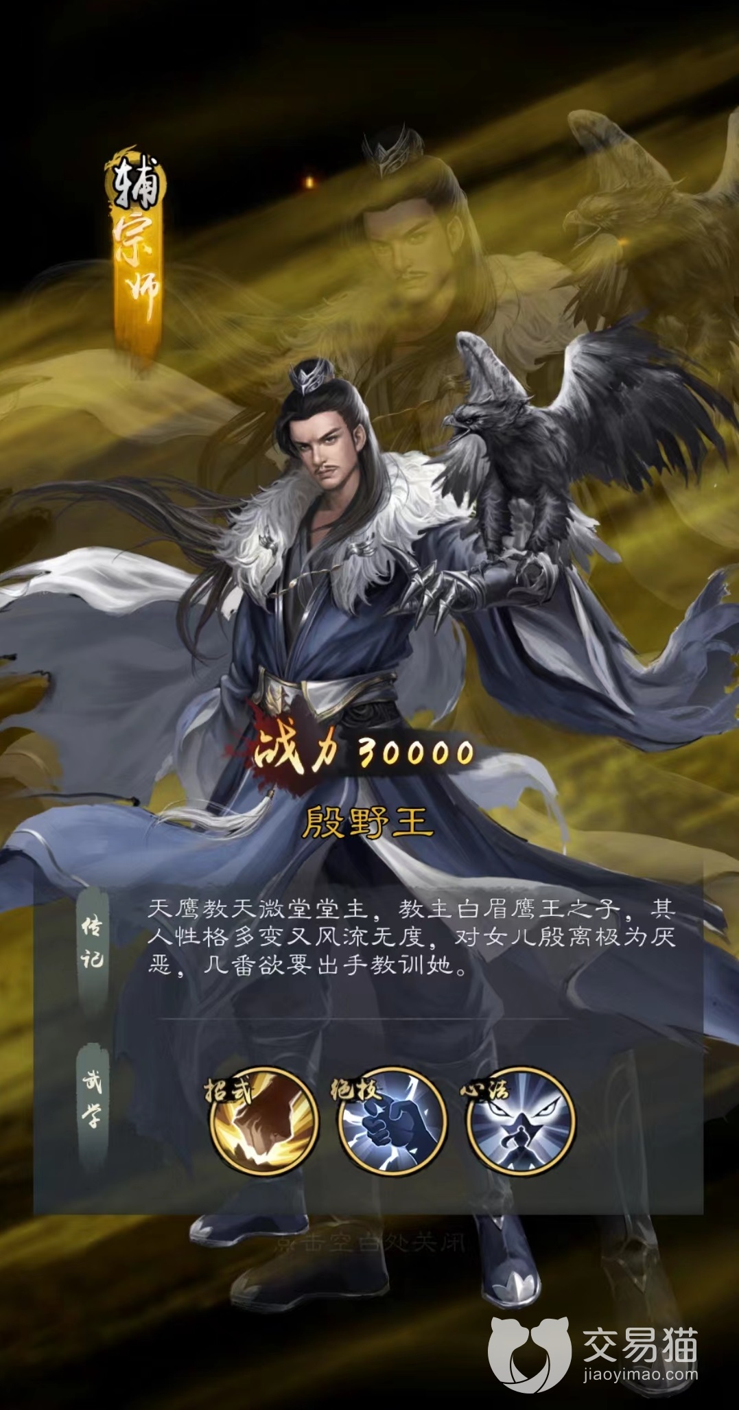 其中鹰野王是目前极好用的辅助角色之一,技能鹰爪擒拿手除了伤害对方全体之外,还可以为我方两名侠客恢复怒气,在获得心法天鹰解穴法之后还增加了解除异常效果的功能。这样殷野王就可以成为队伍中的发动机,持续不断地为其他角色回怒,能够放出更多的技能,而现在大招是非常重要的输出,所以怒气也极其关键。