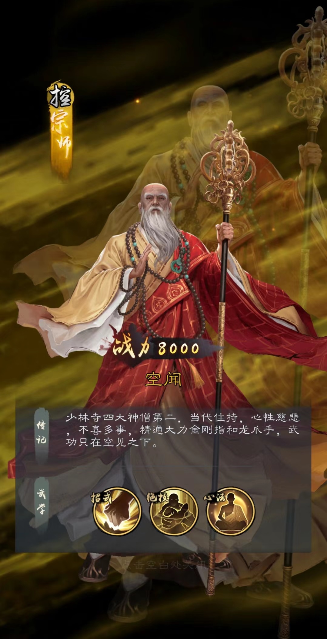 空闻大师同样属于控制类型,但和张翠山不同,他是依靠技能大力金刚指伤害对方一列目标,然后有几率使对方封穴。封穴的效果和沉默不同,被影响的目标可以使用绝技,但无法打出普攻。绝技需要怒气才能释放,锁住了招式也能使对方少很多输出。依靠心法洗髓经每提升一级可以获得300点的血量上限加成,论实际效果血量属性不如攻击,但是后期的空闻也可以当做是前排的肉盾使用,依靠高血量去抵挡伤害。