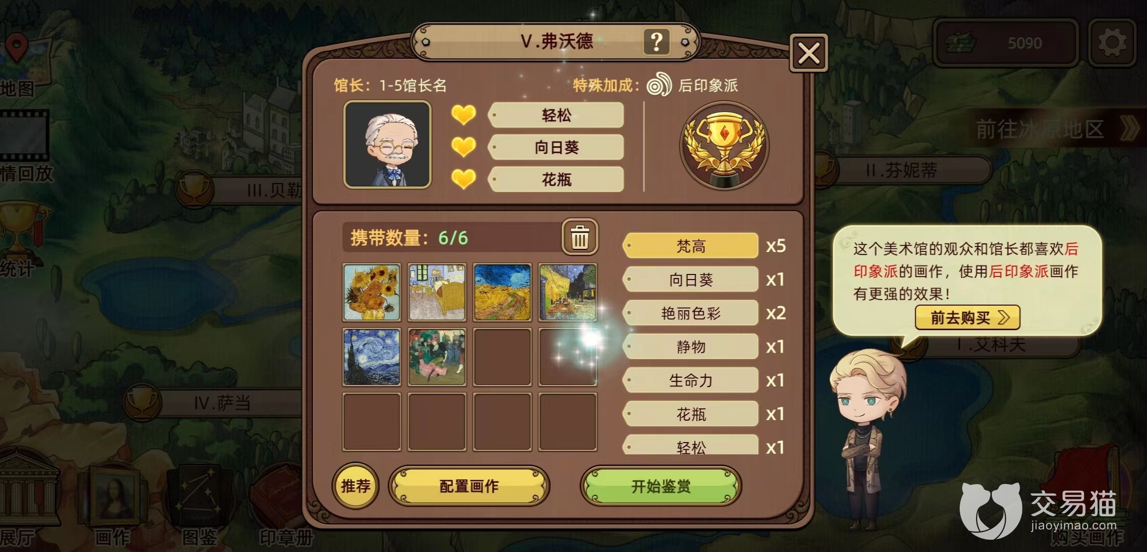 在进入画作挑战前,要先选择画作配置。根据伯恩给我们的提示,可以知道弗沃德的馆长和观众喜欢后印象画派的作品。选画的时候,我们尽量选不同作者的画作,每个作者最好带3幅,这样画作标签属性就更多。