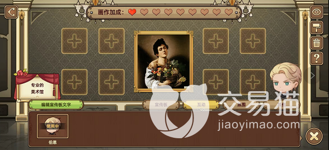 完成挑战后,我们进入展厅后,点击右下角的小沙发,可以看到有宣传板、互动、氛围、其他这四个栏目,选择“互动”这一小栏。就可以在这里找到伯恩了,点击伯恩就可以将他摆放在展厅了。