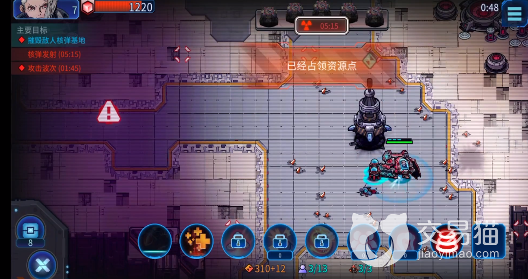 由于每一个的地图都是随机刷新的,小编建议玩家在前期先不要跑太远,围绕着基地附近应对第1波的攻击,占领资源点多存资源。优先建造兵营与科技塔,等到主基地有一定防御力时可出远门,选择地图上的红色目标,前往摧毁核弹基地。