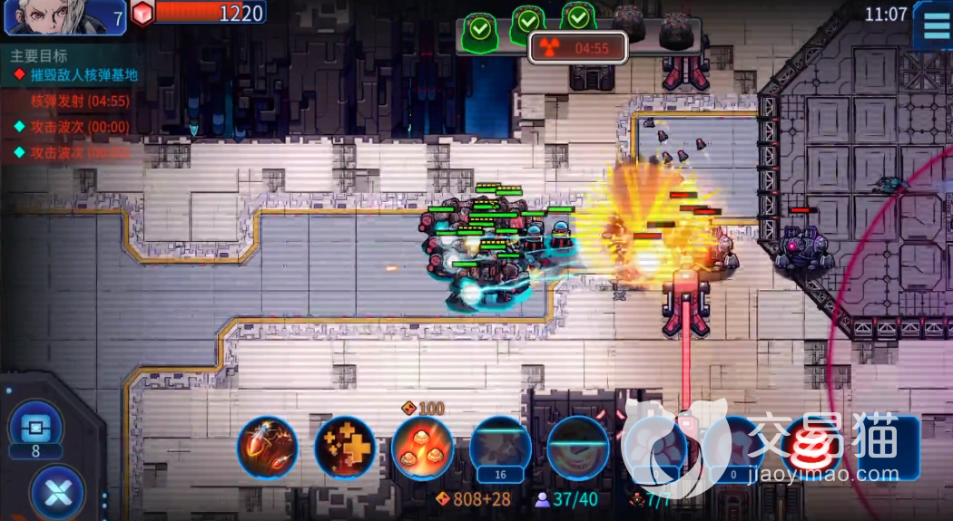 这个地图的攻击频次较高,平均每15至30秒就有一波攻击,小编建议玩家多切换视角看自家基地的情况,避免被敌军偷家。另外是核弹的发射倒计时是5分50秒左右,
