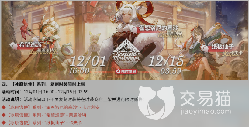 据官方消息,明日方舟风雪过境复刻将在2022年12月1日下午4点到12月15日凌晨4点开启,持续时间保持了一贯的两周,这次活动将重新开放活动关卡,并一次性开放所有关卡,不再分阶段。玩家可以通过攻略关卡获得特定素材,素材可以拿到活动商店兑换相应道具。
