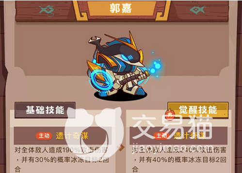 然后就是郭嘉,他的主要技能是控制,拥有对敌人全体造成伤害且有几率冰冻对方2个回合的“遗迹奇谋”,还有受到攻击时使对方有几率冰冻的“冰计”,以及对冰冻目标额外造成伤害的“某城”和自身死亡后有几率冰冻对方全体两回合并回复全体己方自己400%攻击的血量,非常的好用,所以经常会有玩家通过献祭郭嘉,来让自己通关更加顺利。