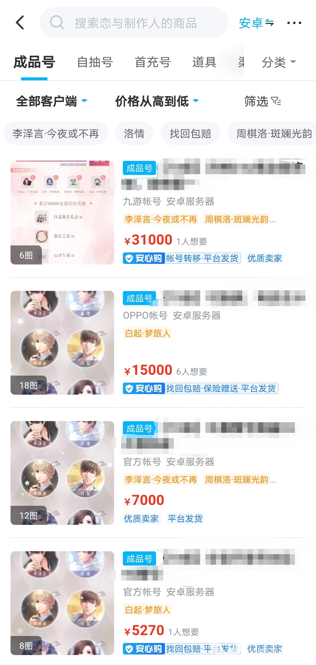 恋与制作人帐号能卖多少钱?关于这个问题,小编进入交易猫app看了一下,将恋与制作人搜索结果按照价格由高到低排序,最高一条定价为3.1w,排在其后的是1.5w,大几千的商品也有不少,虽然不是所有账号都能卖到这个价钱,但总体定价是非常可观的。