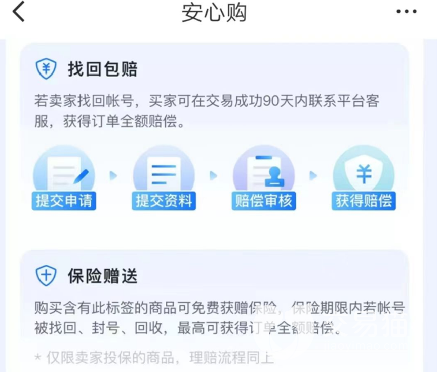 而一些小伙伴们对于交易是否安全?会不会有找回的风险等一些疑虑,而对于这些大家可以完全放心,平台内不仅有安心购保护着大家的权益,如果账号被恶意找回,或者出现问题,打击就可以找到客服申诉,客服在审核后,最高可以全额理赔。