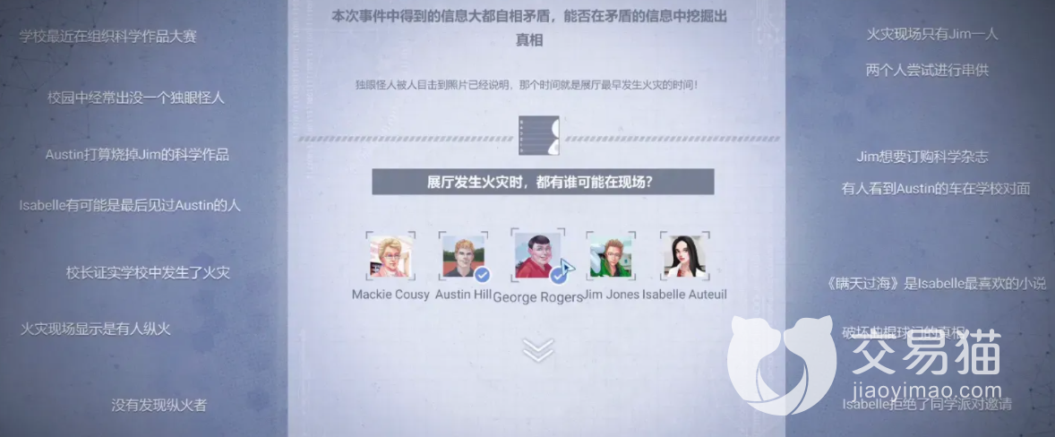 这个时候情况已经差不多了火灾时间是8点,因为科学展览以及作品出了意外引起了火灾Austin和Jim以及lsabelle在现场,最后Austin发生了意外,他们打电话给了lsabelle。有人看到了你们在一起接着他们分工等,到这差不多所有的内容就快结束了。