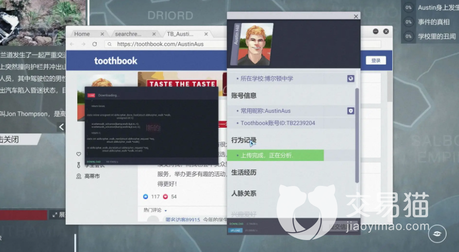 依旧在游戏开局我们点击这次任务发来的链接,会得到主线的第一个人物Austin,我们得到她的名字之后开始收集信息,打开toothbook输入Austin的信息进行查询,我们查到了她的个人主页看到了账号以及曾经担任过一年的学生会长,但是Jim Jones举报了他,向校长。