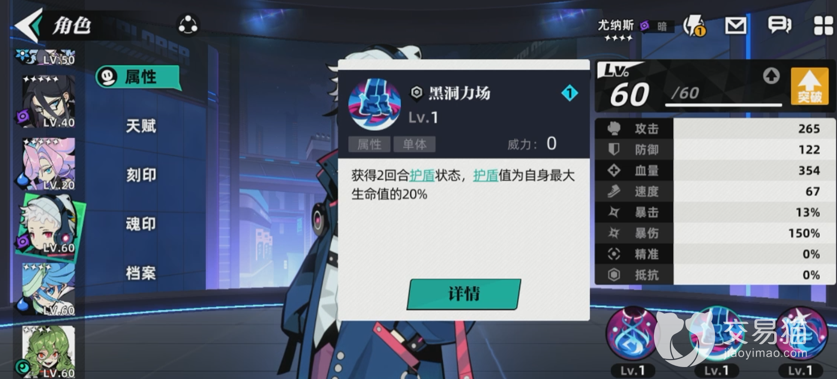 技能方面,一技能只是很单纯的加攻,没什么好说的,不过数值加的还算不错。然后就是角色的核心技能黑洞力场,可以付于自己两回合的护盾,护盾的总体数值为自身百分比的血量,一级的时候就有20%,属实是一个相当不错的技能。