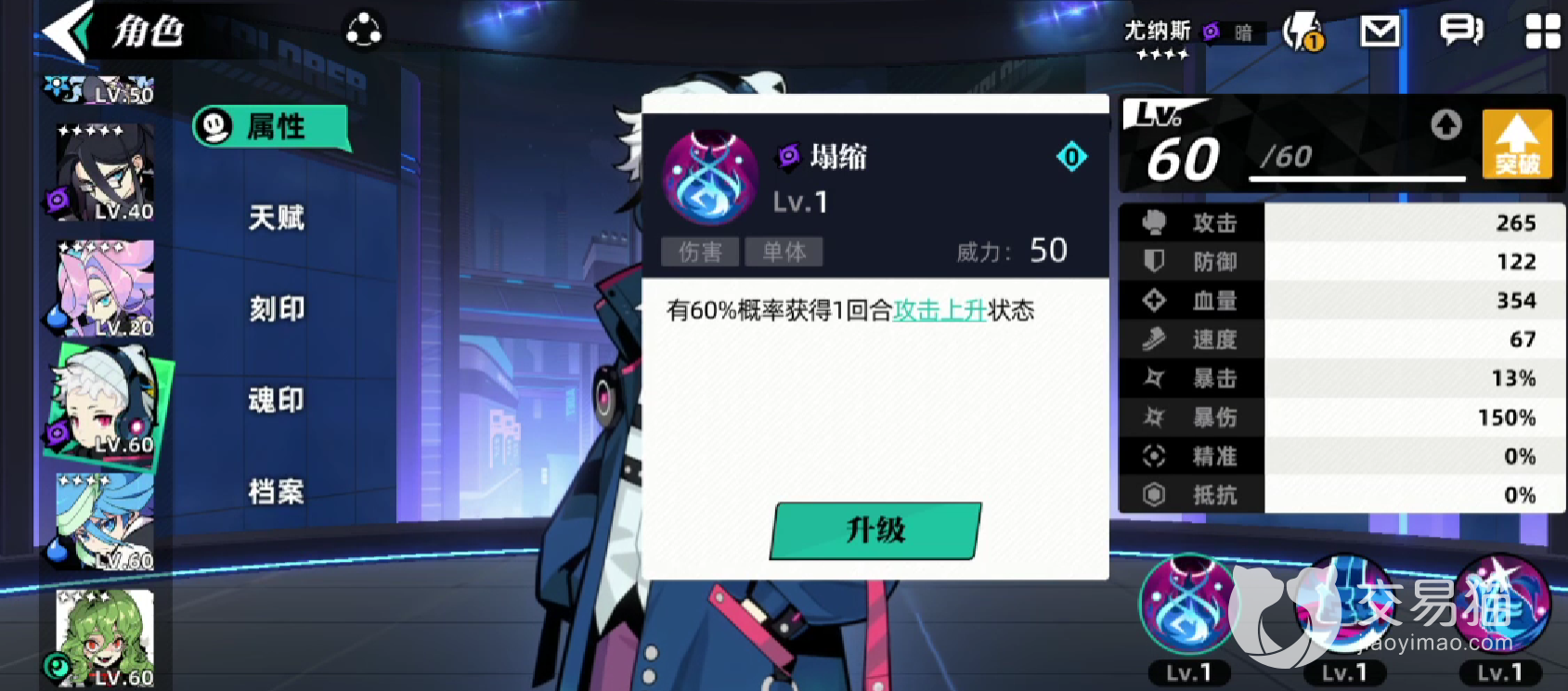 首先是角色的60级的数据面板,265攻击122防御和354血量,还算是不错的数据面板,整体上来看,属于中等偏上的水平。考虑到原型是赛尔号的暗影系之王,可以算是有些低了,不过血量还行。
