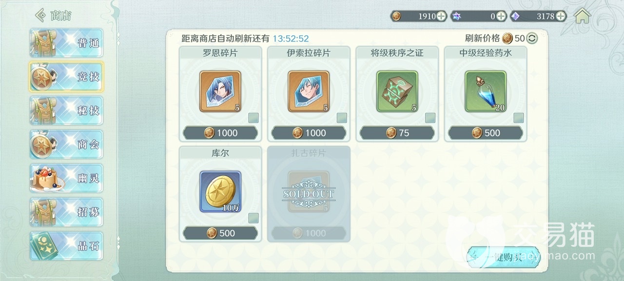 竞技商店所需的货币就是竞技币,是通过参与竞技挑战获得。竞技商店的东西是比较固定的,有sr角色罗恩、伊索拉和扎古的碎片,还有角色神格苏醒材料、经验药水、金币这些。萌新玩家可以去买扎古的碎片,扎古是一个很适合萌新培养的角色,其次可以去买经验药水。