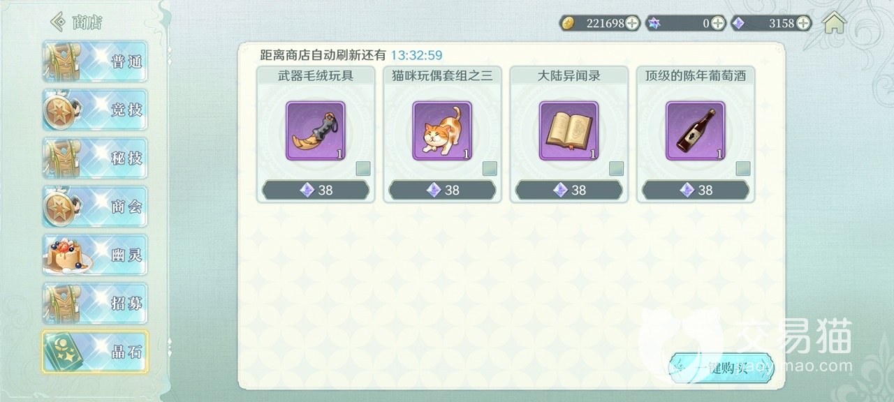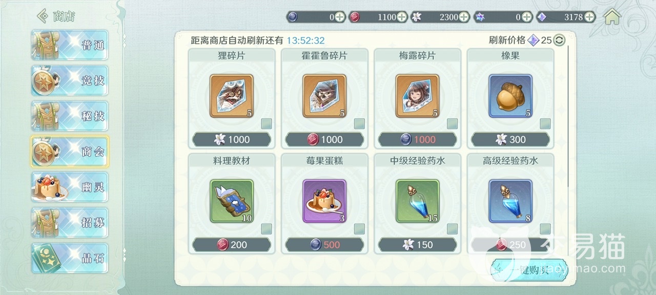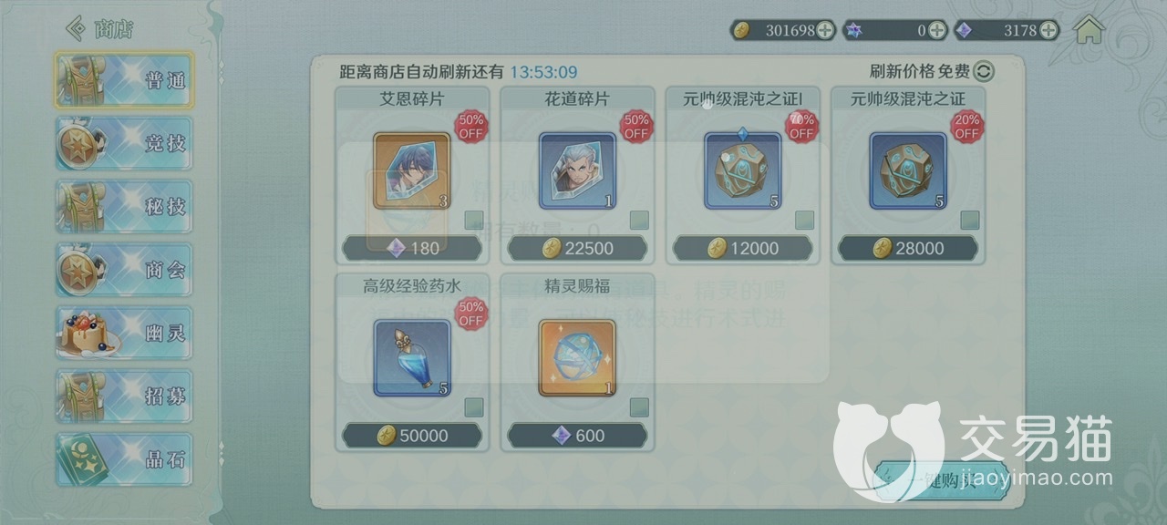 普通商店的物品是比较常用道具,每天有10次的免费刷新机会,如果用完了就要花费稀世晶石进行刷新。每次刷新,里面的碎片、药水和升级材料等级都是随机刷新的,推荐大家可以优先去购买高级的经验药水和神格苏醒材料。虽然神格苏醒材料能打副本获得,但是要花体力刷,体力一般都是不够用的,所以在商店买是个不错的办法。