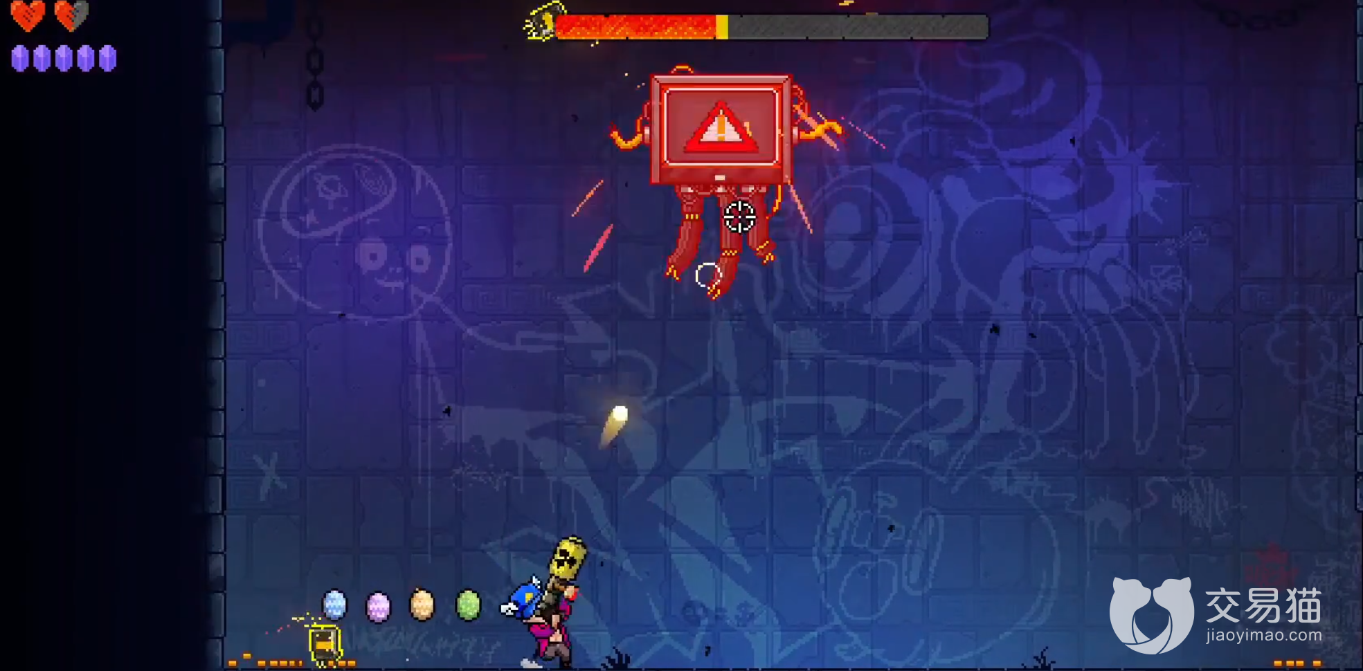 首先玩家来到左边的入口,这个怪物会在左中间等待玩家,玩家需要开一枪展开战斗,这个怪基本上是不会落地的,主要就是释放箭头光标模样的大范围的子弹攻击玩家。