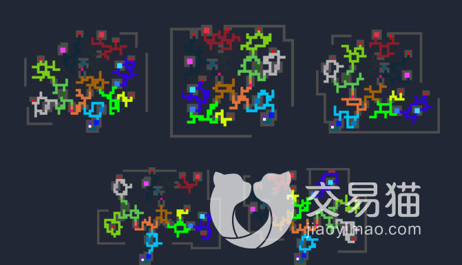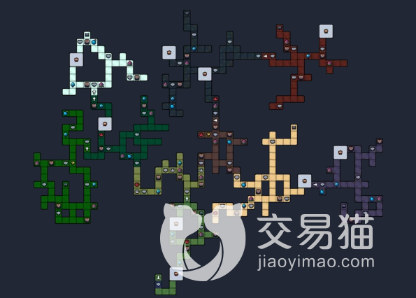 游戏每次开始都会重新生成一种整体构造的大地图,大多数格子会是野外,野外可以打怪,获得素材,积累金币,玩家可以自由的在这里穿梭,不同颜色代表了不同的生物群落,比如白色是雪山,绿色是丛林,黑色是洞穴。