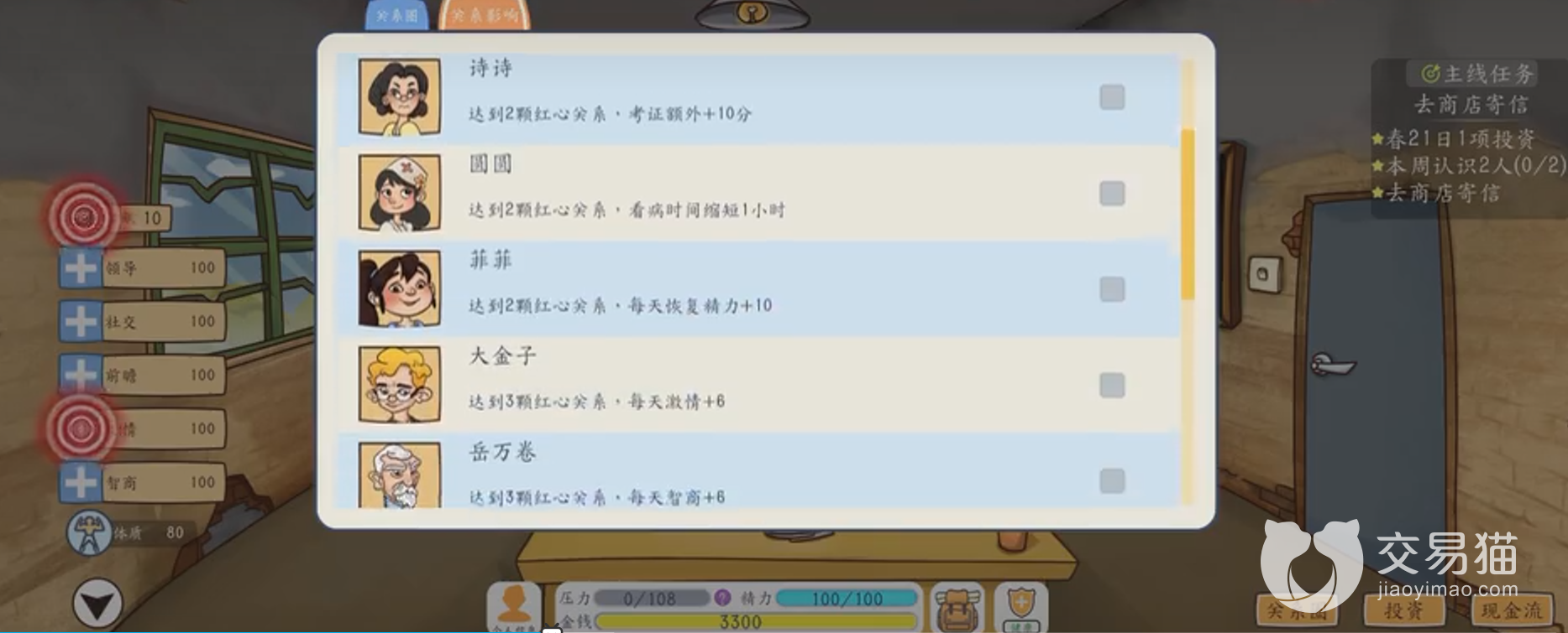 游戏中玩家有各式各样的属性和天赋值,从领导到社交到智商应有尽有,这些游戏主要对之后中期的影响加大,前期无所谓。不过一定要注意的是体质的变化,如果体质掉光了,游戏基本上也就差不多了,所以前期要加紧的,找到一份不错的工作,然后去赚钱,努力的拼搏。