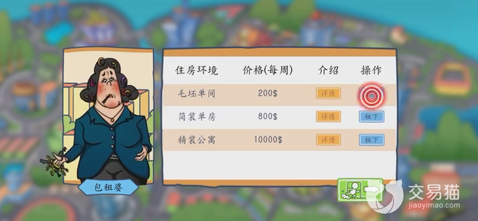 在这款游戏中,我们要扮演一名因为家庭原因而不得不独自在外创业的一个角色,从最基础的工作开始做起,争取赚到100万元去注册公司。不过,一切的还是要从头租房子开始。前期可以省钱,只用毛胚单间,找一份基础工资,后期开始有钱了,再开始进行之后的创业。