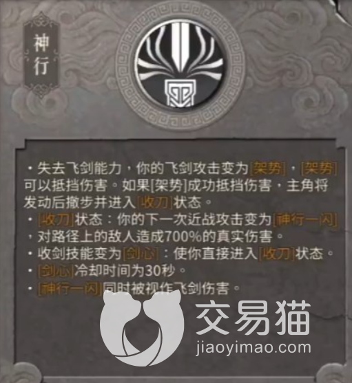 神行这个技能主要的介绍是玩家会失去飞剑能力但是飞剑能够转变,成为附属技能,这样的话附属技能能够帮助玩家抵挡一些伤害,附属技能一旦抵挡伤害成功玩家会直接开启闪身并且武器会直接自动收起来。收起来之后玩家没有武器了只能使用近战攻击,这一次的近战攻击能打出百分之700的伤害,咱们直接手刃BOSS。