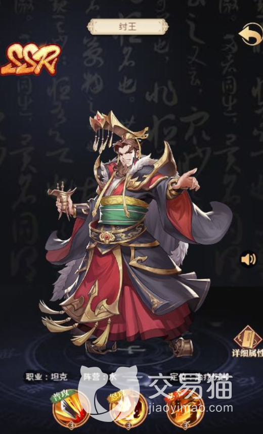 所以接下来要给大家带来了强力卡片,就是妲己以及商纣王。 首先是纣王,范围输出型的战士,自身血量越高,其伤害也越高,而且是一个范围输出本身提升之后,技能可以附带百分比的回复,肉的不行的同时伤害还高,是非常优质的前期推图角色。