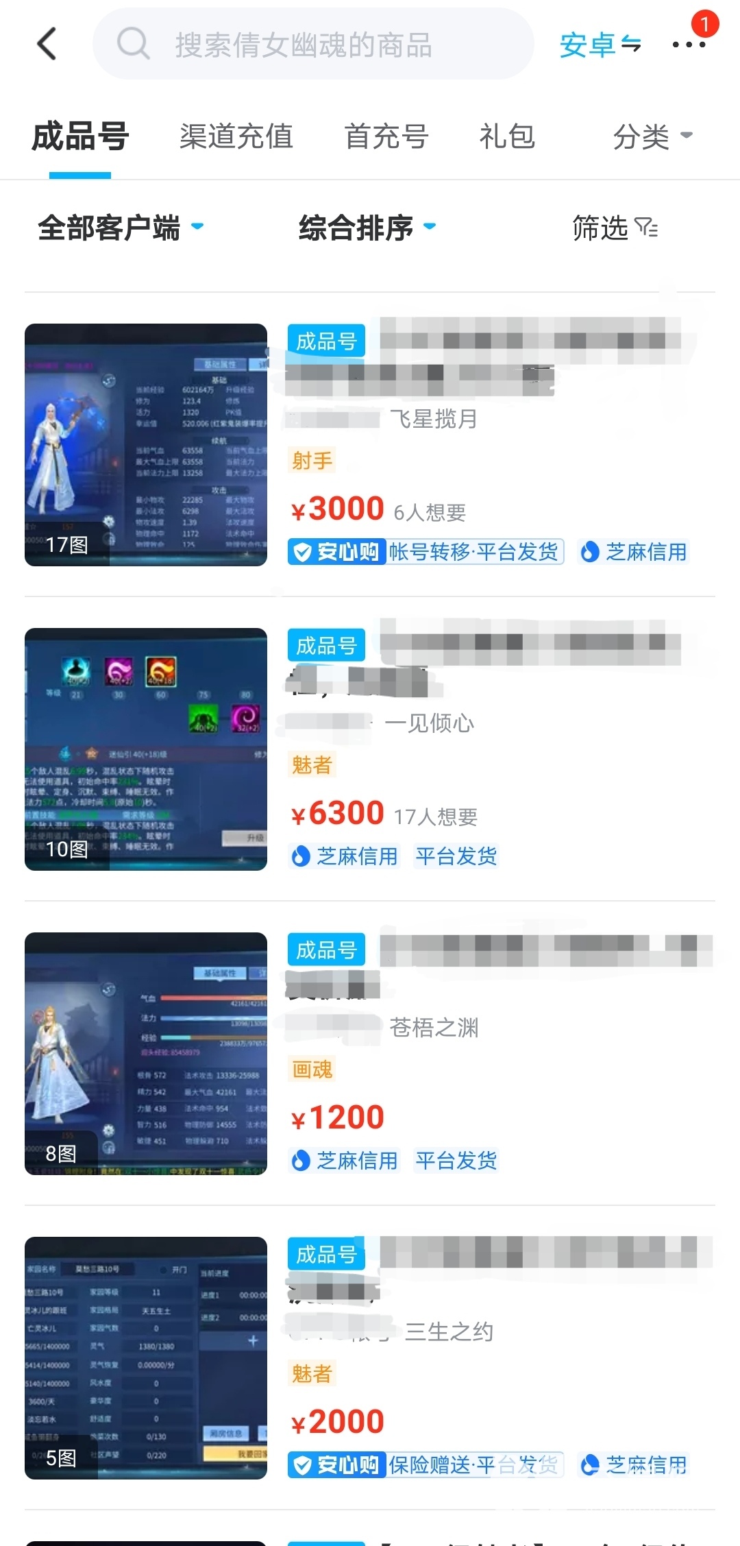 卖家肯定希望账号能卖个好价钱,但许多平台环境不好,人流少,购买力差,账号贬值太多,而当我们进入交易猫app后搜索倩女幽魂可以看到,账号的市场价格是相当可观的!