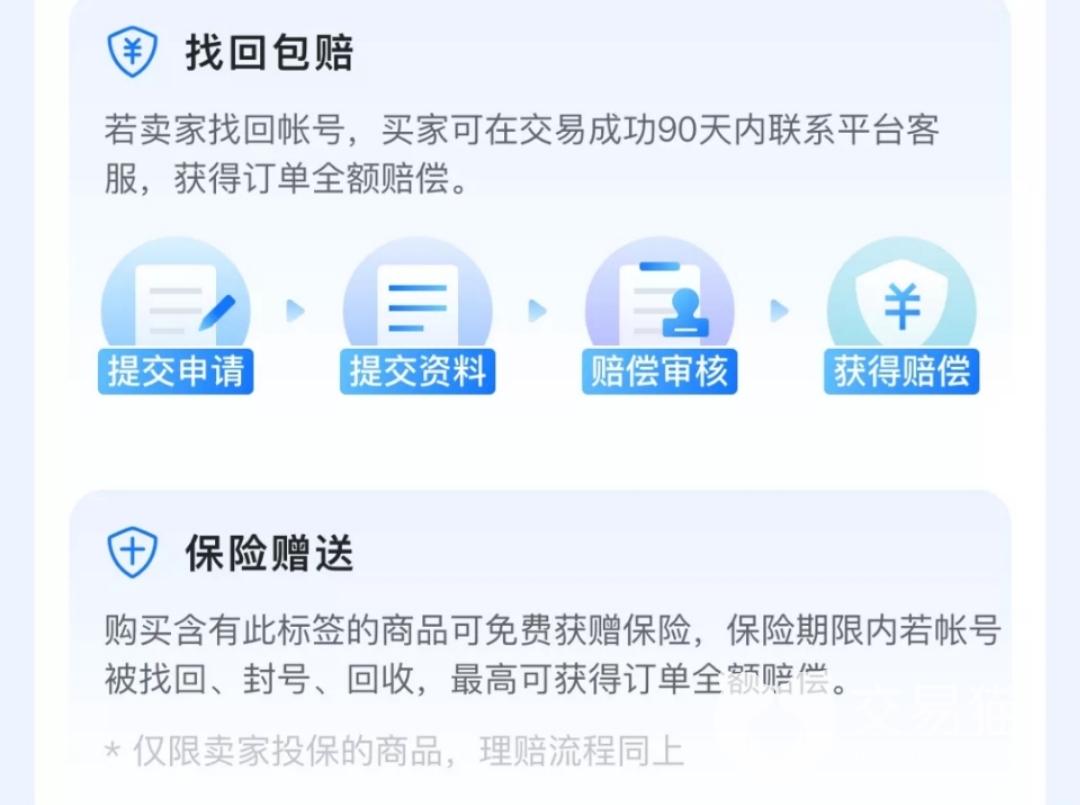 除了优质的售前服务外,交易猫的售后也很优良。平台推出安心保险,针对部分商品赠送免费保险,买家也可以根据自己的需要在下单的时候自行选购保险。保险分为60天保障期和90天保障期,不同保障期对应的保费不一样,购买保险以后大家就不用担心对面找回账号了,可以放心使用新买的账号。