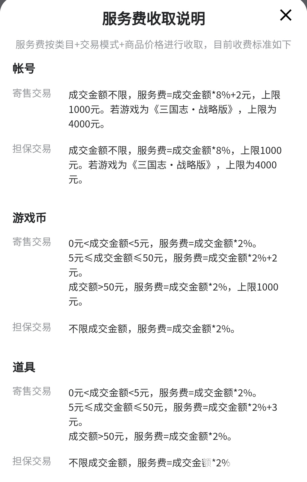 平台设有两种“成为卖家”模式:个人卖家和诚信卖家,前一种是无需缴纳保证金的,一般个人卖号都会选择这种。卖家依托交易猫进行销售,因此平台抽个成也无可厚非,小伙伴们完全不会损失太多。所有交易的服务费都有详细说明,平均抽取不到一成的成交金额,1000元封顶,还是很合理的对吧。