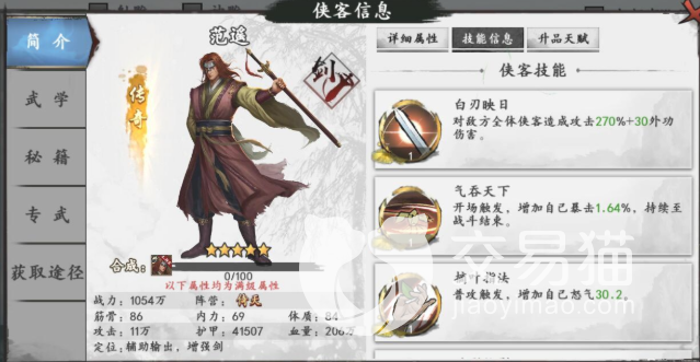 范瑶拥有增强剑,毕竟两个主力输出都是剑客,所以推荐带个范瑶当拐,他能为友方所有剑类侠客带来一个增伤效果,同样还会给友方所有剑职业的角色添加对目标的攻击值,开场也会增加全体剑客的攻击值,所以带一个范瑶的话,这个队伍两个C的输出能提高好几个档次。