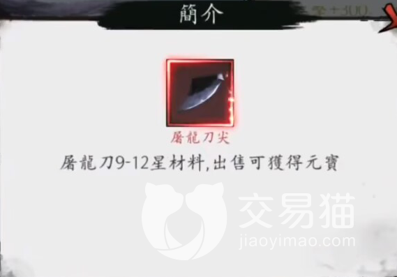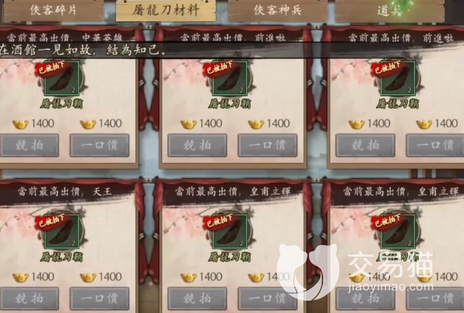 以上就是游戏新射雕群侠传中的屠龙刀材料的相关资料了,想必获得的途径大家也都知道了,需要在拍卖会上用元宝来购买,因为现在没有太多人会竞拍,所以这把武器的价格比以前便宜了不少,一般的玩家都能积攒一些元宝去争一争哦。