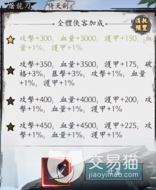 屠龙刀的所有材料,都是用来提升自己的等级,而每个等级的提升,都会牵扯到屠龙刀的各个部分,刀鞘,刀柄,刀锋,刀尖。除此之外,屠龙刀魄也是每个阶段都能用到的东西,屠龙刀升级之后,团队可以得到攻击力、生命值、防御力、暴击率、爆发力等各方面的属性,而且这个数值非常可观,到了后期,一颗星辰就能让团队拥有数十万的战斗力。